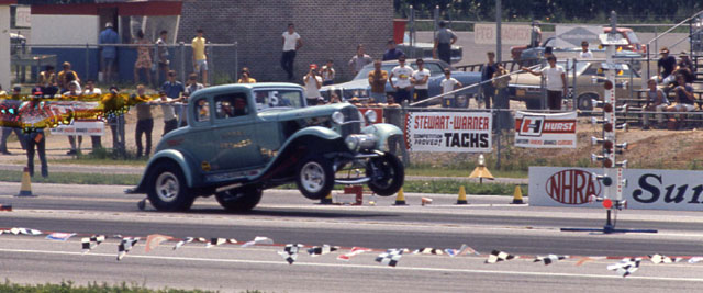 A nice look at the York starting-line area as local racer (Munroeville, Pa.) Harry Luzader blasted off the line in his E/Gas '32 Ford coupe with an injected small-block Chevy and four-speed transmission.