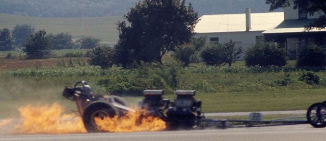 The team of English-Frakes-Funk is well-known to many fans, probably for its hard-running Kentucky Moonshiner Top Fuelers of the 1970s, but the trio – Bill English, Robert Frakes, and driver Dale Funk – also fielded this twin-engine Top Gas dragster earlier in the decade. McDonald noted that the car is sporting a flat right-rear tire and speculated that the flat may have led to the oil pan(s) dragging, kicking off this blaze. My money's on a blown engine and a puncture caused by debris. Love the background; interesting top end, eh?