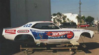 “The [paint] when delivered from Don, was all faded, where the red flames looked orange. When I showed up there, Kenny [Youngblood] was already masking the front to airbrush the front grille/headlights. When Kenny completed the front (it looked great), the before photos arrived at the shop – oops -- apparently, this flopper had an issue with a fire after a run. Since it was near the end of the season, the front was repaired with the next-year grille design. Kenny had me remove his fresh airbrush job, then repaint it with the other (next-year) grille, so the rear of the flopper has an earlier taillight style from the front. The white paint, the red flames, and Hot Wheels background was laid on at the Paint-N-Place. All other stuff was hand-done by Kenny … no decals.”