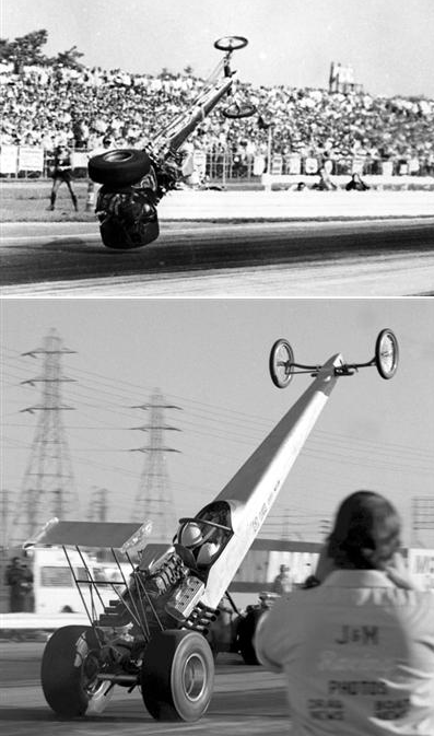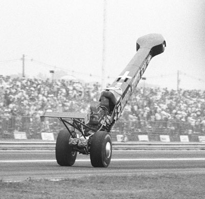 The anatomy of the modern-day blowover was pretty simple. For varying reasons, the car would get the front tires into the air well after leaving the starting line, and air pressure at that speed would work to hold the car aloft and lever it backward. Fortunately, in a large number of cases, the gyroscopic effect of the rear wheels turning would give the car a half-twist so that it landed backward – but upright – on the track, thus limiting injury mostly to hurt feelings and a very bent race car.