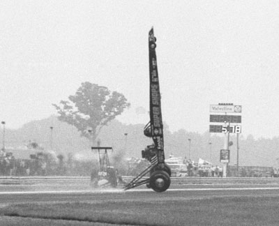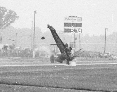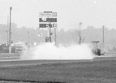 "At about the 1,000-foot mark," related Garlits, "the front end came up suddenly, and I reached for the brake real fast -- because I'm programmed for that now -- but by the time I got the brake and pulled it back, the car was straight up in the air and turning overbackwards. The car went 215 mph through the lights upside down and backwards; 5.51 was the e.t., with the rear wheels tripping the e.t. lights after I had skidded the brakes as hard as I could, so [the car] was on a good pass."