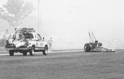 “Then the car shot forward out of the smoke; y'see, I was still holding the throttle down because I was still disoriented, and so I'm holding the throttle down, and the car shoots out of the smoke, and I'm looking, and I'm looking at the starting line! I said, ‘My God, what's going on here?!’ So I still hadn't pulled off of the throttle, but I did then push the fuel-shutoff valve immediately, and then backed off the throttle. I couldn't steer it anymore because the steering was all jimmied up from the impact. It was just going where it wanted to; it was kinda making a slow left-hand turn, and I ended up right on the edge of the track where I went straight up. It came back to the point of origin.”