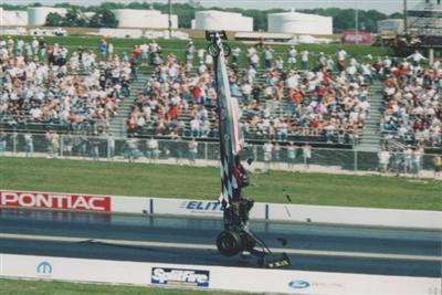 It was more than two years between Shelly Anderson’s blowover at the 1996 Brainerd event and the next one to befall a racer, but Pat Dakin won’t soon forget when his number came up in Topeka in the fall of 1998. Racing Doug Kalitta in round one, Dakin’s mount reached for the sky, flipped overbackward, and glanced off the top of the guardwall and slid to a stop, right-side up, in the shutdown area.