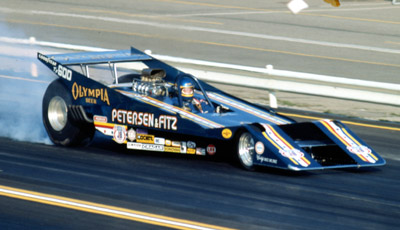 Petersen in 1975, finally able to fly the 61 on his car after winning the Division 6 Top Fuel championship the year before (Jerry Bennett photo)