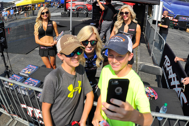 Traxxas-sponsored Funny Car racer Courtney Force joined some young fans for a selfie at the Traxxas radio-control demonstration track in the pits.
