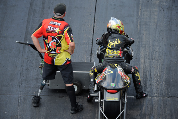 This has been a tumultuous week for the Star team in the wake of the recent bombshell announcement that riders Cory Reed and Angelle Sampey would be leaving at the end of the season, but their on-track performance has not appeared to suffer. Reed earned a top-half starting spot with an eighth-best 6.884, and Sampey challenged for the top spot before eventually dropping to No. 2 with a 6.831 best. Because they are on opposite sides of the ladder, Reed and Sampey could not race until the final round.