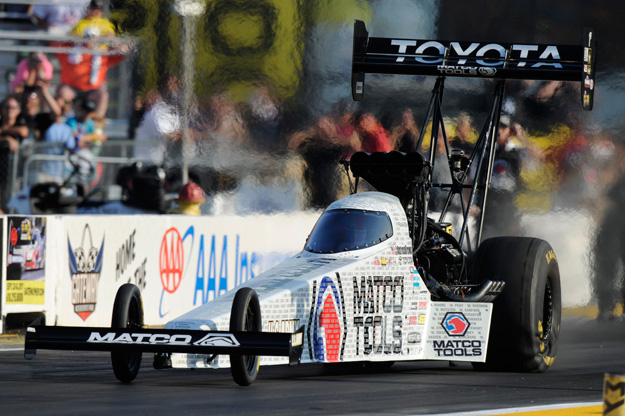 After a sterling outing in the Countdown opener in Charlotte, points leader Antron Brown and the Matco Tools team have struggled mightily and ended up just No. 12 on the grid, their worst start of the season (previous worst was eighth, in Topeka). The team came into Saturday’s final two qualifying sessions in the No. 12 spot after missing the tune-up and smoking the tires to a 5.46 in Friday’s night’s “hero” session, leaving him with his first pass of 3.808 to rank on the scoresheets. It didn’t get any better Saturday, when he ran 3.811 and an early-shutoff 3.928, leaving him No. 12.