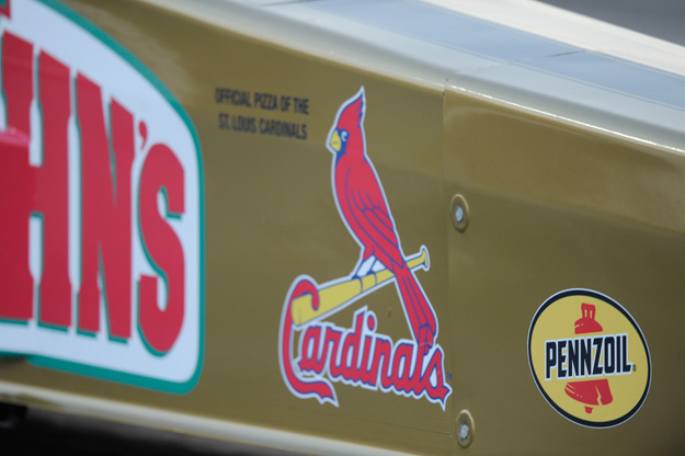 Sharp-eyed St. Louis fans of the local baseball team may have noticed the St. Louis Cardinals logo riding aboard the Papa John's-backed dragster of Leah Pritchett. No, the former Southern Californian and now resident Hoosier isn’t changing loyalties. Papa John's is the official pizza of the Cardinals (in fact, all of Major League Baseball as well as the NFL), so the team is showing its support of that partnership this weekend in the home of the former World Series champs.