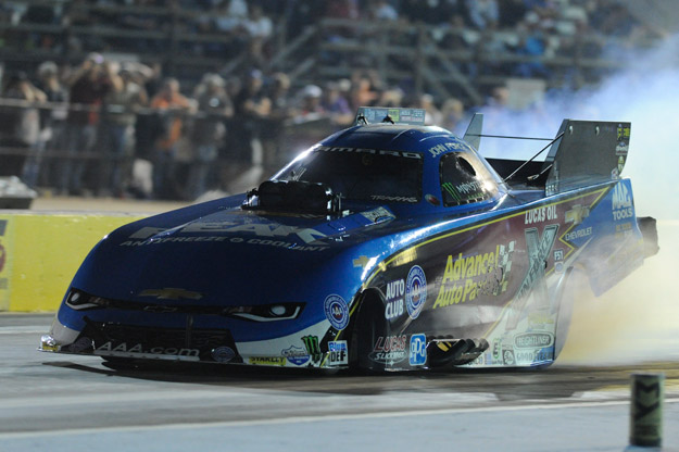Jack Beckman’s incoming track records of 3.909 and 326.32 mph, both established last year, didn’t last long. The e.t. mark was broken in the fifth pair of the first qualifying session by Courtney Force, whose Traxxas Chevy ran 3.895, and bettered one pair later by her teammate Robert Hight and his AAA Texas Camaro, which ran 3.870. The record did not remain in the Force camp, though; in the final pair of the session, points leader Ron Capps ran 3.864. The three bonus points he earned probably pleased him more in his tight points battle with second-place Tommy Johnson Jr., pushing his teammate to 27 points back.