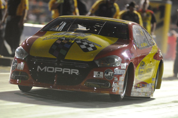 The second pair of the second session was plagued with troubles. First, Aaron Strong shut off and was pushed off the starting line after three attempts at doing a burnout failed. Then, Jeg Coughlin Jr.’s Dodge (pictured) had a rare-for-Pro-Stock oildown, causing a starting-line cleanup that delayed things a bit. According to reports from the top end, the oil was coming from the breather on the dry-sump tank.