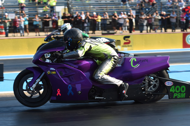 “The old drag racing ties brought us back because we were tired of getting hurt in motocross, and we miss our friends, and we have a lot of respect out here with everybody,” said Courtney, who admits to big nerves before his first official run today. “It was very nerve-racking. I’ve never been that nervous. I’ve been down the dragstrip a million times, and that had me sick, but after I went down the strip, I was good.”
