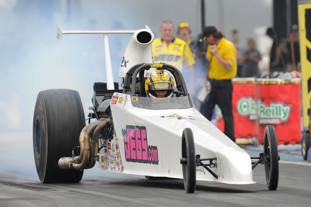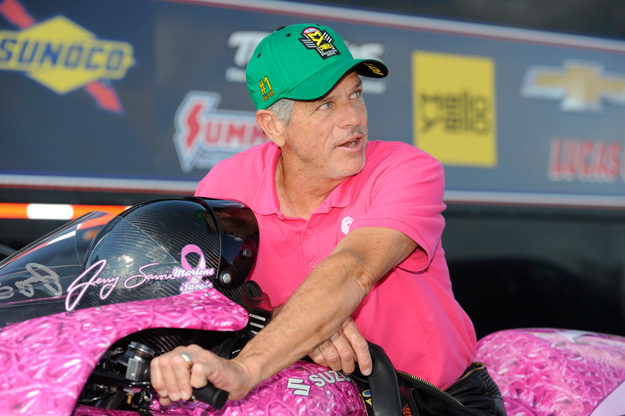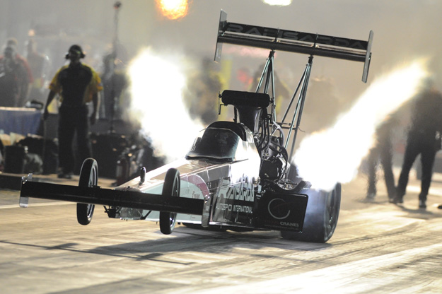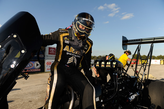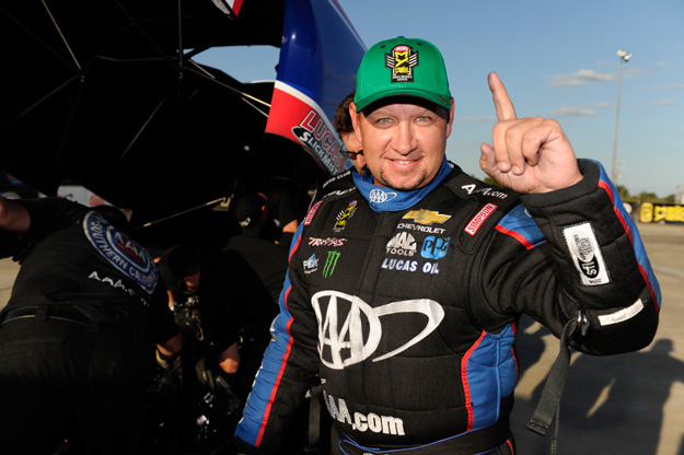 Tony Schumacher, who won the driver home-run derby during the Fan Fest two weeks ago in Reading, is in desperate need of a home-run weekend to stay in the championship battle. After a fifth-best 3.76 in Q1 Friday, he lost his chance during the evening “hero session” when his Army dragster went more up than forward on the launch, leaving him ninth and, with warmer temps Saturday, in jeopardy of not having lane choice Sunday. Schumacher, as usual, was nonplussed: “All this interesting stuff that’s happened today, it may set the field, but it doesn’t win races. We’ve had Friday-night sessions get away from us, but we’ve found ways to get back after it when the heat is on."