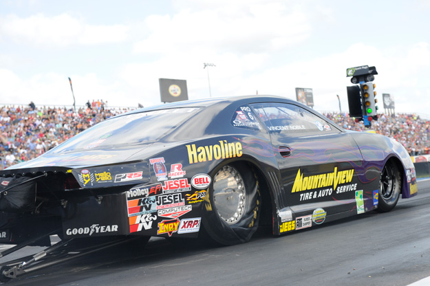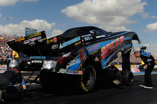 “I honestly can’t put a finger on it,” said Venables, whose charge this weekend is wearing Pennzoil colors. “Obviously, speed is a combination of horsepower and aerodynamics, and we [the Don Schumacher Racing Funny Cars] all have the same bodies and same superchargers and heads and everything else, so it’s hard to put an exact finger on it. I’m definitely aggressive with the engine – I think me and Jimmy [Prock, crew chief for Jack Beckman, who set top speed Friday at 333 mph] are the most aggressive. Part of it is how you apply the clutch. When these cars hit 8,500 rpm, you pull the engine down to make it [continue to] accelerate, and you have to climb out of that hole again, but you’ve only got a certain distance to do it, and it’s only going to climb at a certain rate. If you can make it run fast early without pulling it way down, you’re going to start higher in the middle of the track. That’s the basic equation for everyone.”