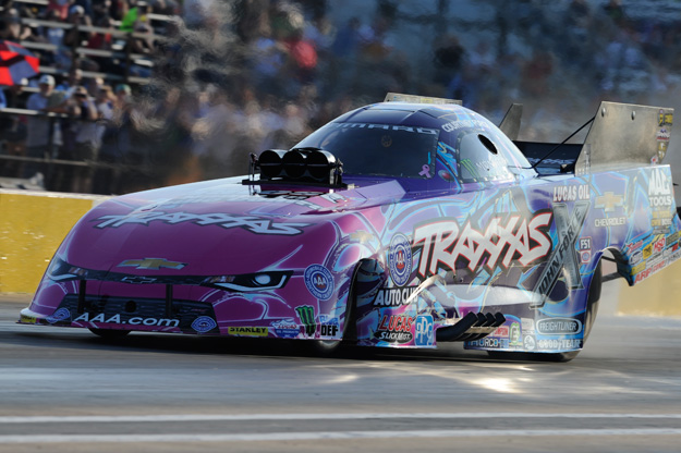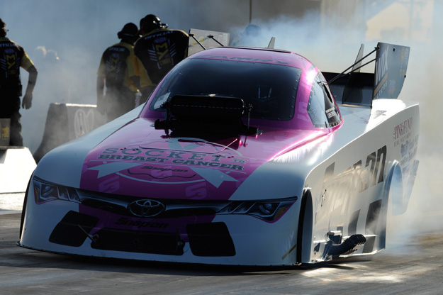 “I’m not sure what happened,” he said. “It went right down through there, but right when I lifted off the gas, it shot me over to the wall. It was amazing. I just kind of scraped it; I don’t think it’s hurt too bad. It took out the [front] wing and hurt one of Brittany Force’s [rear] wheels – we’re scuffing tires for them – but it could have been worse. There’s no oil on the track, and the car ran great and felt great, so we’ll get it ready for [Sunday].”