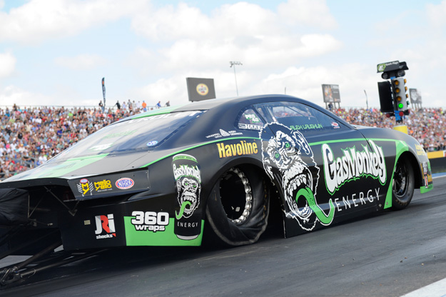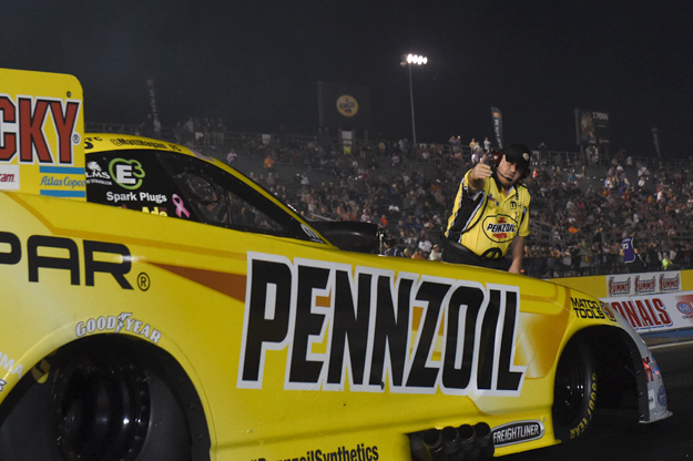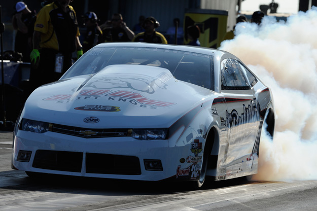 “This car is definitely making up for the dragster,” said Laughlin. “It definitely was weird hopping out of that car into this one. Like I got into the Pro Stock car, and one of the crew guys says, ‘Hey, hold the brakes so I can torque the wheels,’ and I grabbed the shifter to pull it back because it’s a hand brake in the other car. I was a little worried because I’ve never run two extreme classes at the same event before, and there’s no similarity whatsoever. We had some mechanical issues with the dragster, so we didn’t get qualified in it. I am going to race it in Vegas, though, so hopefully redeem myself there. This car is definitely taking up the slack. We’ve made four qualifying passes, and we’ve been among the fastest every session, and we’re qualified No. 3. Conditions today aren’t nearly as good as they were yesterday. To go out there and run a 6.60 [in the first session] is super respectable, and the car moved around a little bit going down the racetrack, so it even had a 6.59 in it. My crew chief is definitely making me look good, so if we can’t win some rounds tomorrow, then, hey, that’s on me.”