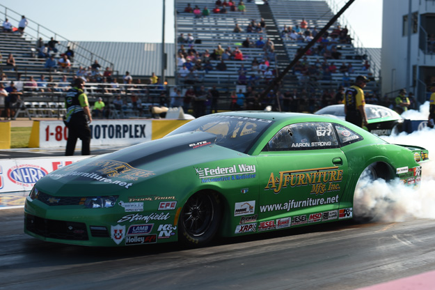 After a disappointing Friday night when a transmission problem prevented him from making a pass in the second session, Aaron Strong rebounded well today, making two solid runs, the best of which was a 6.68 that earned him the No. 13 starting spot and a first-round match with Shane Gray.