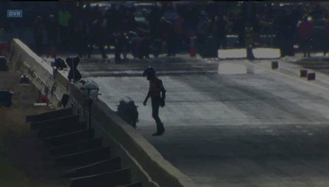 In addition to the damage to the chain guard, the broken chain broke the wheelie bar, forcing Johnson to a backup. Johnson sat out the first run today but returned for the final session, entirely due to the new wheelie bar.