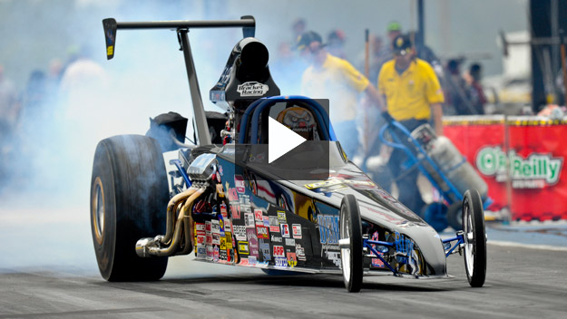 Leading the pack of new winners was Top Alcohol Dragster champ Bradley Thompson, who drove Tom Conway’s injected nitro dragster to a final-round win over Shawn Cowie, who fouled. Thirty Top Alcohol Dragsters were competing for 16 spots, so just making the field was half the battle, especially after rain reduced qualifying to two sessions. Though qualifying was shortened, the end result was a record 5.352 bump spot, and Thompson was in the thick of the battle with a 14th-best 5.326. Thompson stayed in the 5.3-second range in the first three rounds, first topping Bill Litton. He then defeated Chris Demke and Joey Severance, who have combined to win the last three TAD season titles. [Watch video]