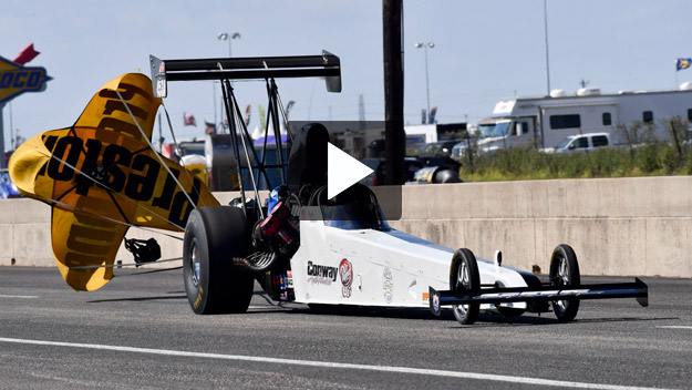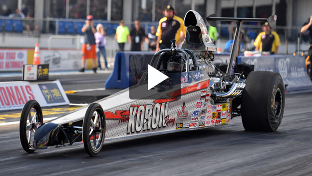 The final of Top Dragster presented by Racing RVs ended on the starting line after chassis builder Danny Nelson fouled by two-thousandths, making Jeff Koron a winner for the second time in his career. Koron used a string of 6.3-second runs to reach the final, including a perfect 6.348 on his 6.34 dial in round one to stop William Kruse’s 6.0-second dragster. [Watch video]
