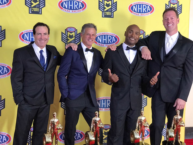 Antron Brown, Ron Capps, Jason Line and Jerry Savoie were the headliners crowned as world champions Monday evening during the 2016 NHRA Mello Yello Drag Racing Series awards ceremony at the Ray Dolby Ballroom at Hollywood & Highland.