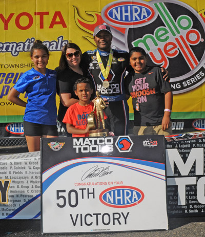 Antron Brown celebrated his milestone 50th NHRA national event win with his family last year in Englishtown.