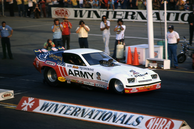 Some of Prudhomme’s greatest accomplishments came during his years in Army-backed Funny Cars. Prudhomme first got backing from the Army in 1974, and he bannered the sponsor on several different cars. The most famous of those was the Monza Prudhomme piloted in 1975-76. The Bob Brandt-tuned car went on an incredible run during those seasons that is still considered to be one of the most impressive string of events by a driver/car in history. The nearly invincible car won six of the eight national events in 1975 and seven of the eight in 1976.