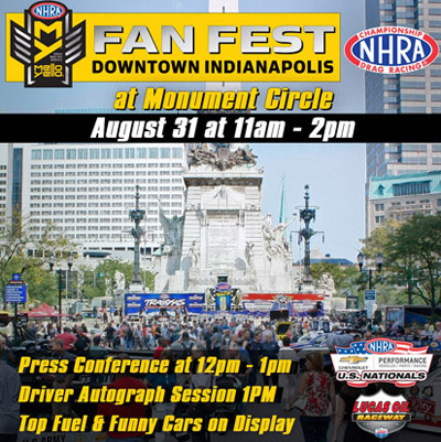 The NHRA Mello Yello Drag Racing Series Fan Fest, the traditional event kickoff for the Chevrolet Performance U.S. Nationals, will take place Wednesday, Aug. 31, in downtown Indianapolis at 11 a.m.