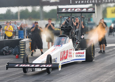 Crampton, who also won the 2014 Automobile Club of Southern California Road to the Future award, posted the quickest Top Fuel pass of the session when he navigated his Lucas Oil dragster down the track in 3.701 seconds at 320.28 mph. The time is quicker than the current Lucas Oil Raceway elapsed time track record of 3.740 seconds held by Shawn Langdon. Crampton unofficially broke the track elapsed time record at last year’s test session, too.