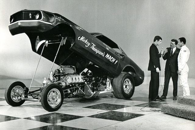 Ongais and Thompson show off the Mickey Thompson’s Mach 1 entry during a studio session. Ongais drove one of Thompson’s team Mustangs during 1968 and 1969.