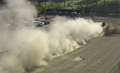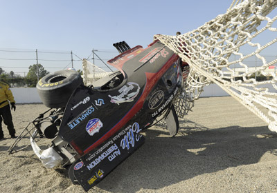 The retired schoolteacher and nitro veteran ended up in the top-end sand trap and safety net. Densham climbed out of his car safely, with the safety net, the Grant Downing-built chassis, and safety equipment working as intended. Densham was checked and released by NHRA emergency services officials.