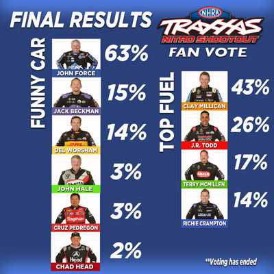 Legendary Funny Car racer John Force and 2015 Top Fuel lottery drawing winner Clay Millican are the winners of the fan vote of Traxxas Nitro Shootout that was concluded Tuesday.