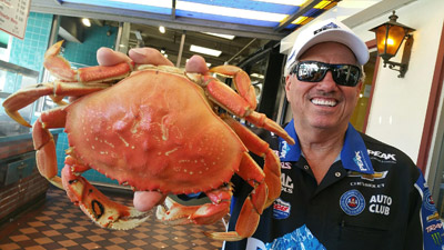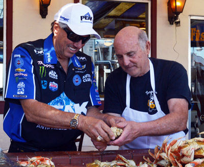 The 16-time NHRA Funny Car champion joined restaurant owner Gus Geraldi behind the famous Fisherman’s Wharf crab stand to crack crab and visit with locals and tourists before sitting down to lunch with local media members. Fishermen's Grotto opened in 1935 as the first sit-down restaurant on San Francisco's world famous Fisherman's Wharf.