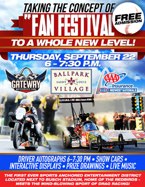 NHRA Mello Yello Drag Racing Series fans will have the opportunity to meet their heroes at a free fan fest and driver autograph session Thursday, Sept. 22, at Ballpark Village in St. Louis. The fan fest will kick off the 5th annual AAA Insurance NHRA Midwest Nationals, Sept. 23-25 at Gateway Motorsports Park.