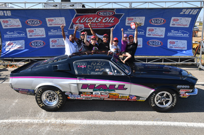 Hall was quick to dedicate his latest win to his late mother, and he acknowledged the ongoing support shown by the rest of his family, including his father, Sonny; brother, Steven, who is a two-time national event winner in Stock; and wife, Kelly Pott-Hall, who also competes in Stock with a manually shifted K/Stock Mustang.