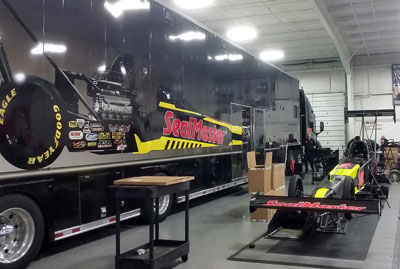 The folks at MAD Creative Design have been spending a lot of time at our shop the past few weeks getting our trailers and dragsters ready for the 2016 season. Not only did they wrap two dragster bodies with the new SealMaster design for J.R., but they wrapped two new bodies for Doug’s Mac Tools dragster. It takes about a day to print the wrap, and then another day to install the wrap onto the panels of the car. On top of the dragsters, they unwrapped five of our trailers, re-wrapped those five trailers, and have also made some adjustments to the wraps of two other trailers. We’ve definitely been keeping the “MAD men” busy!