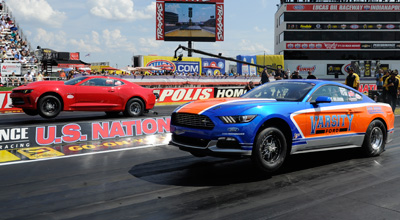 Chris Holbrook, near lane, drove his new Varsity Ford Cobra Jet to the SAM Tech Factory Stock Showdown title with a final-round win over Stephen Bell's COPO Camaro. Along the way, Holbrook made the sport's quickest Stock pass with an 8.23 at more than 165 mph.