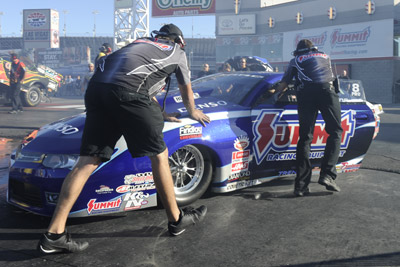 Waiting for Anderson in the final was teammate Line, who had the second-quickest car behind Anderson in the first two rounds, in which line bested Shane Gray and defending champ Erica Enders. The final ended up being a little anti-climactic when Line’s car started leaking fluid after his burnout, and he was shut off and pushed off the starting line. Adding insult to injury for Line, who has never won the Horsepower Challenge, Anderson’s car shook early, and he coasted to a 12.33 victory.