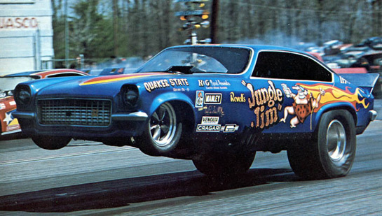 This is a great image because it shows the No. 2, near lane, racing No. 3 at Maple Grove. Roy Harris is in No. 2 with Liberman in No. 3. From 1970 to 1974, I created what I call my "FC Notebooks." Because we had a large family, I couldn't afford to save every issue of ND, so I used to type up the key facts from every fuel match race and clip the best photo captions into a notebook. (Yes, I was a Funny Car nerd! LOL)I found the caption to this "dueling Jungle Jims" photo: An all-"Jungle Jim" final round for Funny Car Eliminator was a side-by-side affair until Roy Harris, driver of Liberman's