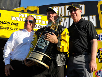 Mello Yello's Al Rondon, left, and NHRA President Peter Clifford congratulated Jason Line after he clinched his third Pro Stock world championship.