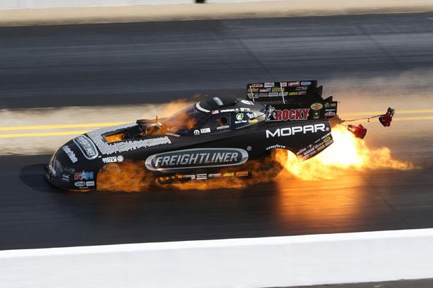 Matt Hagan is no stranger to big engine explosions at zMAX Dragway, having been involved in a number of big boomers at the Charlotte-area track over the years, and he once again lit ’er up on his final qualifying run today.