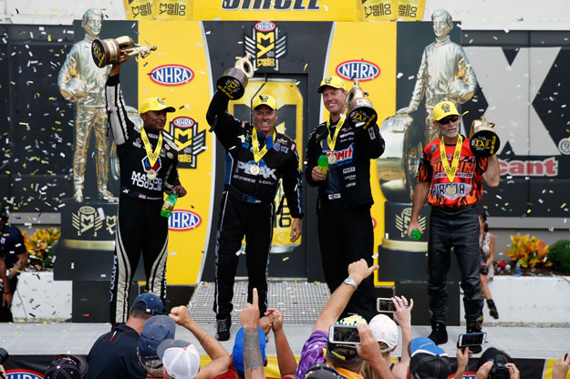 NHRA Carolina Nationals winners, from left: Antron Brown, John Force, Jason Line, and Chip Ellis