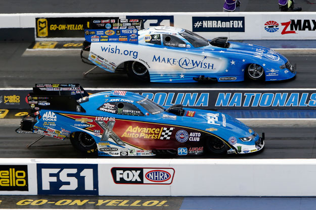 Though he has 16 world championships under his belt, it is still fair to say that John Force, near lane, entered the 2016 Countdown to the Championship flying under the radar a bit. After all, Ron Capps had dominated the regular season, and in recent events, Del Worsham and Matt Hagan had shown a lot of potential. Add in Tommy Johnson Jr., who was the clear leader in qualifying for the NHRA Carolina Nationals, and it’s easy to see why many may not have been looking Force’s direction. That all changed during final eliminations at the first race of the Countdown when Force, who also had a solid qualifying outing, outlasted Johnson to claim the first playoffs Wally and valuable points toward a potential run for a 17th title.