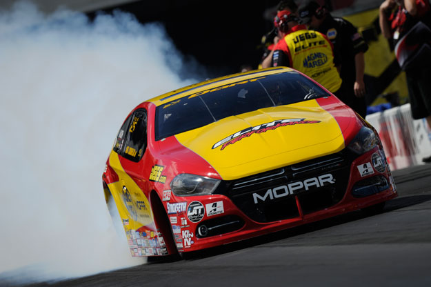 Jeg Coughlin Jr. didn’t win five world championships and 58 national events without being crafty and resourceful, so minor details like a bottom-half starting spot and lack of lane choice aren’t going to faze him. Coughlin started the Countdown in the No. 10 spot, but he moved up a few notches following a round-one win over Allen Johnson’s Marathon Petroleum Dodge. It was the second time this season that Coughlin has defeated fellow Dodge driver Johnson.