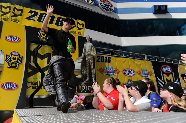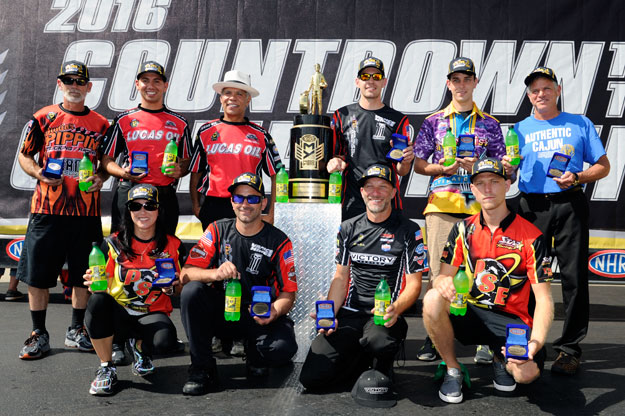 Prior to the opening round of eliminations, the 10 drivers vying for the 2016 Top Fuel world championship gathered for a photo around the trophy which they all hope to be hoisting at the end of the season.