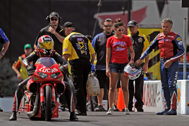 Anyone who thinks that Hector Arana Sr. might have taken a dive for his son, Hector Jr., in their round-one race in Charlotte obviously doesn’t know the competitive nature of the Arana family. Hector Sr. was unable to make the run after his Lucas Oil Buell broke an oil-pump belt on his burnout.