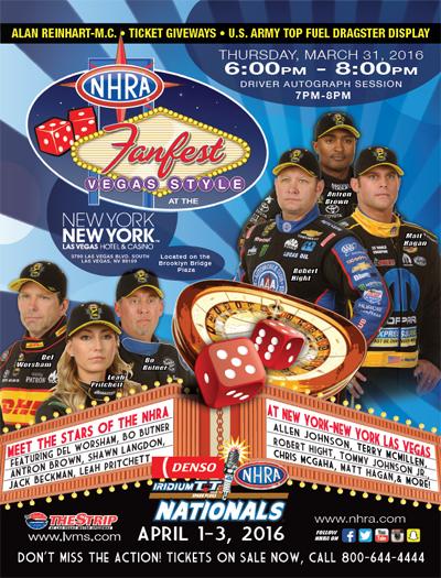 The popular NHRA FanFest, Las Vegas style, will return to the New York-New York Hotel & Casino on Thursday, March 31, in advance of the Denso Spark Plugs NHRA Nationals at The Strip at Las Vegas Motor Speedway.