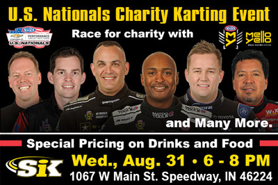 NHRA Mello Yello stars will forgo their usual straight-line racing and take to the twists and turns of the Speedway Indoor Karting go-kart track Wednesday, Aug. 31 during the Chevrolet Performance U.S. Nationals Charity Karting event.