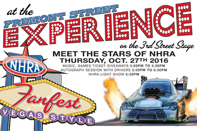 Fans of the NHRA are going to want to be on Fremont Street Thursday night. That’s where 30 of the NHRA’s top stars will be attending NHRA Fanfest on Thursday to sign autographs and promote the 16th annual NHRA Toyota Nationals, which runs Thursday through Sunday at The Strip at Las Vegas Motor Speedway. World champions Antron Brown, Erica Enders, and Del Worsham will be part of the festivities, which run from 5-6:30 p.m. Pacific Time at the 3rd Street Stage.