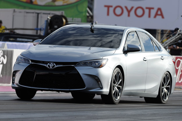 Toyota-sponsored Top Fuel driver Doug Kalitta made a pass in the company’s “super sleeper” Camry, which sports a nitrous-fed TRD-supercharged 5.7-liter V-8. Although Kalitta took it easy on his exhibition pass, Toyota says the tube-framed, tilt-body car is capable of a 9.8-second quarter-mile.