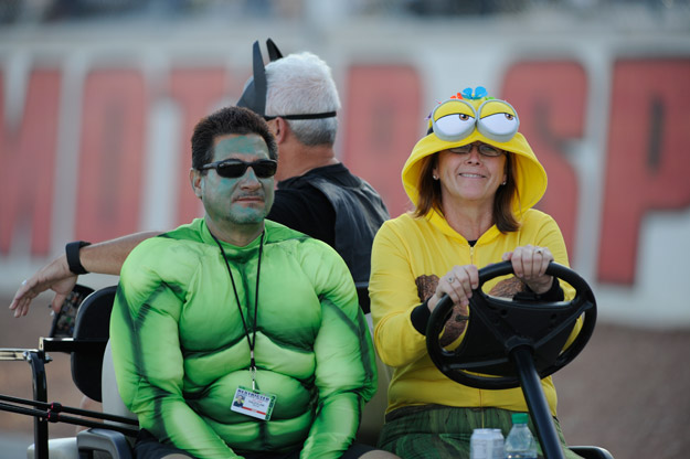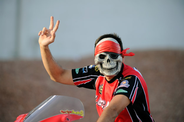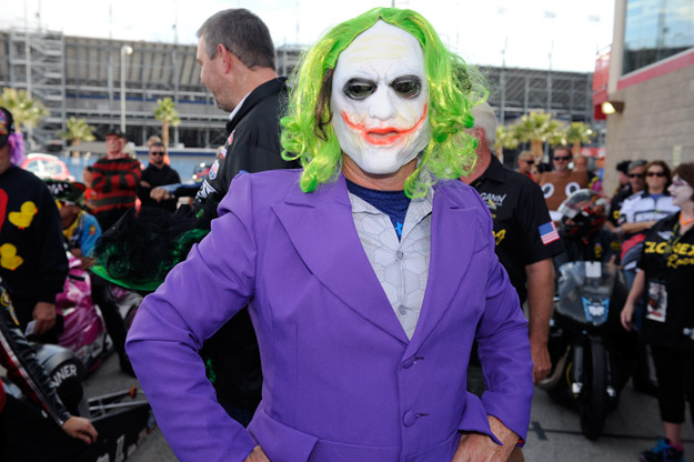 No group embraces Halloween more than the Pro Stock Motorcycle contingent, and the teams once again came up decked out in costumes ranging from super heroes and villains to Olympic athletes for the final qualifying session. However, one member of the two-wheel community got off to an early start with his “costume.”